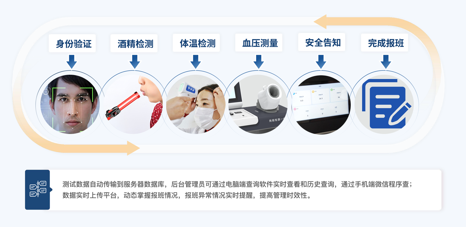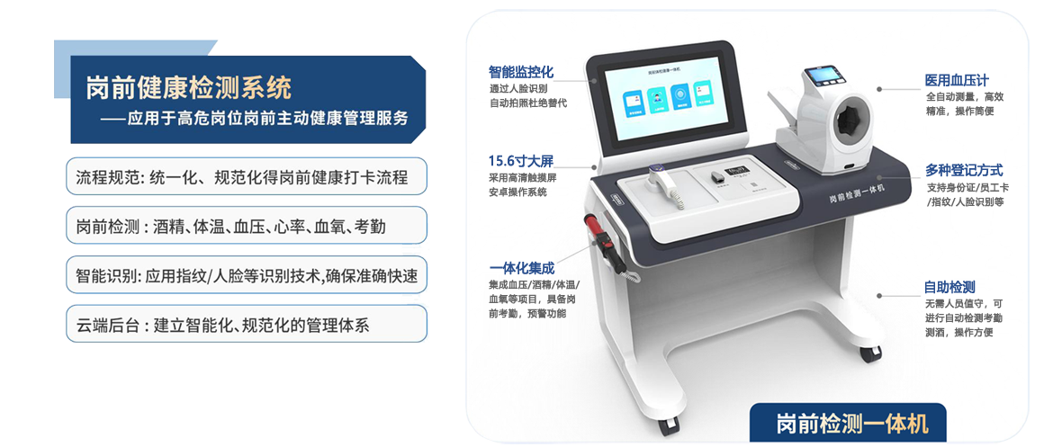 崗前健康檢查一體機是一種用于進行員工健康檢查和篩查的設備,可以通過指紋識別、人臉識別等方式快速登錄,并可準確地檢測員 工的健康狀況,包括 血壓、心率、酒精、體溫、血氧 等多個項目,對于符合上崗健康狀態得員工允許考勤打卡。