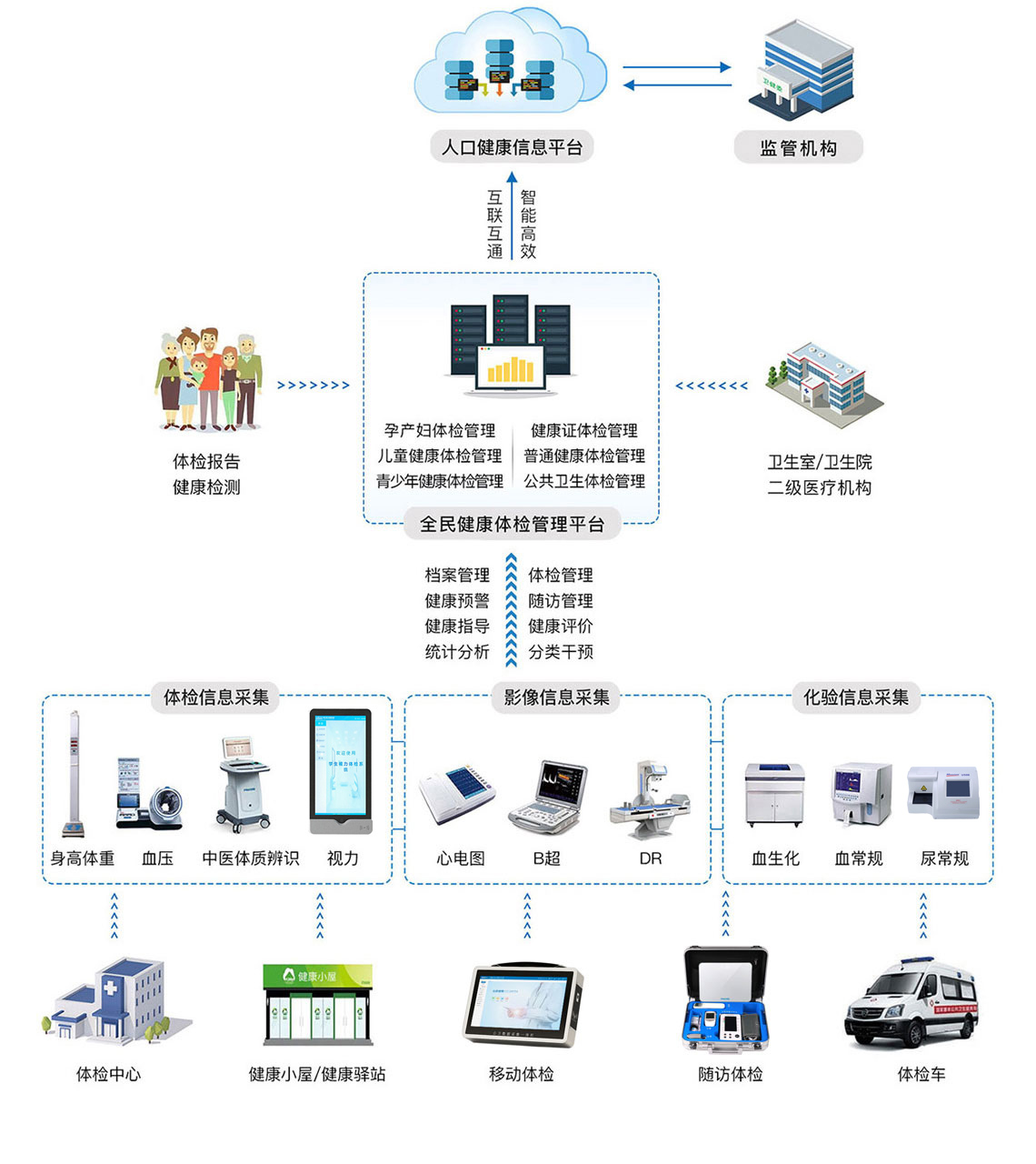 普瑞森·區域全民健康體檢管理平臺以“便民、惠醫、輔政”為設計理念,采用云計算、大數據、物聯網、移動互聯網等信息技術,通過整合全民醫療健康信息資源,構建城市級健康醫療大數據中心,為健康城市打造堅實的數據基礎。 平臺實現各橫向業務機構和縱向管理機構信息互聯互通與業務協同,促進形成有效的分級診療服務體系,優化區域醫療資源配置,提高醫療服務水平和醫療質量,降低醫療費用,提升衛生綜合管理水平和政府綜合決策能力,給健康城市建設提供堅實的信息化基礎。